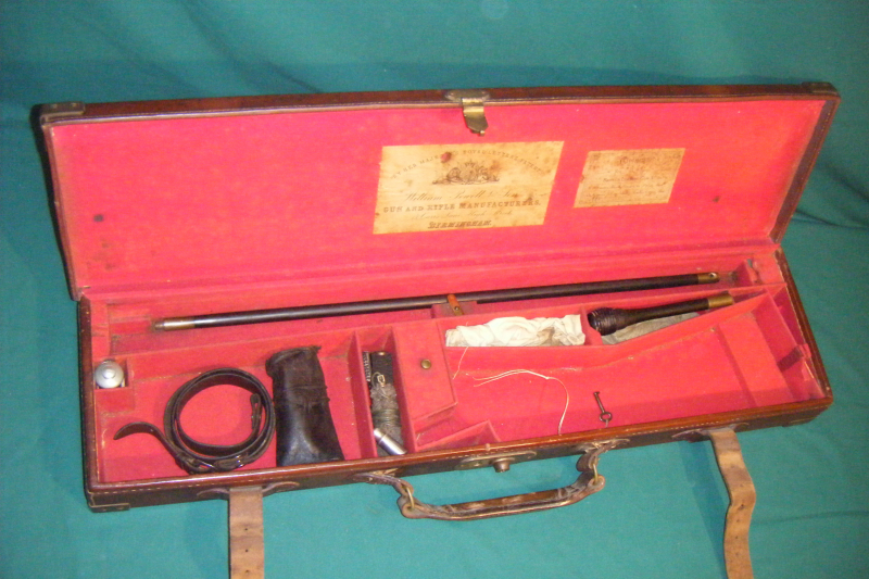 Sie bieten hier auf einen sehr gut erhaltenen englischen Flintenkoffer von William Powell & Son aus dem Jahr 1892, der am 6. August an M. Castellanos aus Bilbao ausgeliefert wurde. Die Angaben wurden von der Firma Powell so bestätigt. Leider fehlt die Schrotflinte, aber es ist noch noch das ganze originale Zubehör vorhanden. Der Zustand ist wirklich gut für das Alter von 130 Jahren. Nur die Nähte am Griff sollten neu genäht werden. Herr Castellanos ist der Onkel des ersten Präsidenten des Fußballclubs Athletico Bilbao, aus dessen Besitz dieser Koffer stammt. Wenn Wenn Sie Fragen haben, senden Sie mir bitte eine Nachricht. Alles andere finden Sie auf den Bildern. Der Verkauf erfolgt unter Ausschluss jeglicher Garantie oder Rücknahme.
