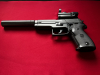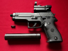 An der Pistole wurde eine Aufnahmeschiene (Metall, kein Kunststoff) für Leuchtpunktvisiere und eine passende Schalldämpferaufnahme montiert. Das Leuchtpunktvisier kann unterschiedliche Leuchtpunkte ( . + * etc.) darstellen in den Farben Grün und Rot (Leuchtpunkt sollte neu eingeschossen werden).