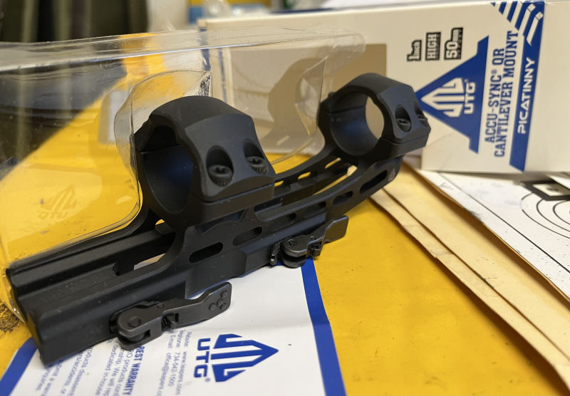 UTG Accu-Sync Cantilevermontage für 1 Zoll Zielfernrohre, mit Schnellverschluss, Sattelhöhe 22mm, 50mm Cantilever Offset, mit Originalverpackung und Beschreibung, Zustand siehe auch die Bilder.