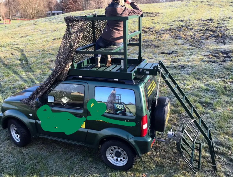 Betker Autodachkanzel Drückjagt Erntejagt. Zusammenklappbar mit Leiter. Details im Internet. Entgegen dem Foto ist die angebotene Kanzel in schwarz, ansonsten die gleiche Ausführung.