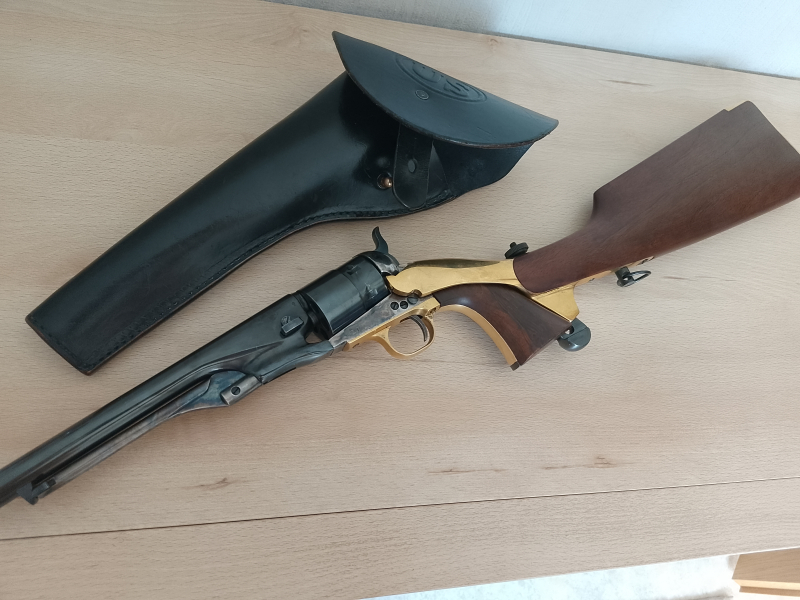Hallo, biete einen sehr gut und ungeschossenen Westernrevolver 1861 mit Tasche und Anschlagschaft an.