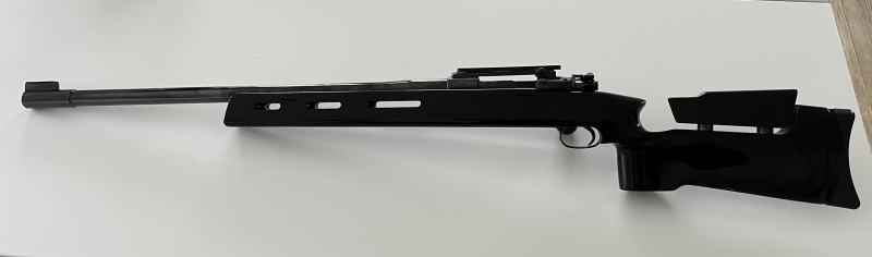 65 cm Lothar-Walther-Matchlauf (24mm/ Mündung 27mm) Timney-Abzug, gebettetes System (Acraglas-Bettung), Schwenkmontage für Aufnahme von Diopter als auch Zielfernrohr