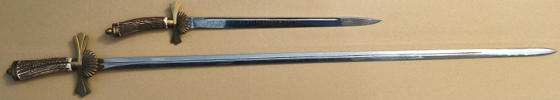Degen: Horngriff, 110 cm lang, Gesamtlänge Klinge ~93 cm, scharf sind circa 80 cm, ~9,6 mm dick. Beidseitig geschliffen. ~950 gr, Kupfer-Parierelement
