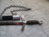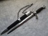 Scheide: Stahlblech mit dünnem Lderbezug. Eloxierte Alu-Scheidenbeschläge mit Madenschrauben befestigt. Alukette mit Herstellerstempel.