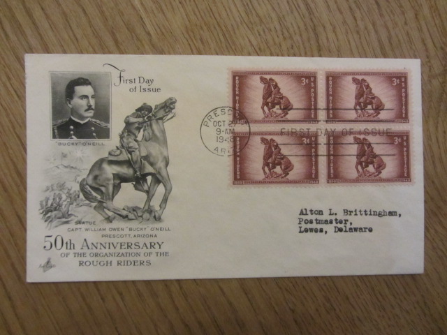 Ersttagsbrief von 1948, Rough Riders, die rauen Reiter, war der Name, der dem 1. US-Freiwilligen-Kavallerieregiment während des Spanisch-Amerikanischen Krieges seitens der amerikanischen Presse gegeben wurde. Ersttagsbrief zum 50. jährigen Jubiläum der legendären Einheit. Direkt und original gerade eben aus den USA erhalten.