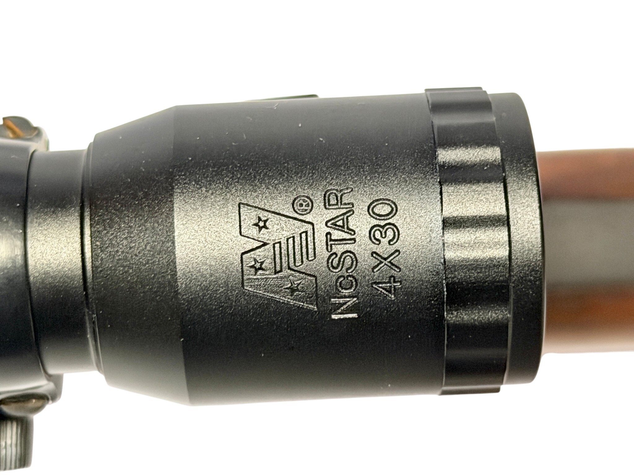 Im Lieferumfang sind neben der Waffe selbst noch das abgeblideteZielfernrohr der Marke NcSTAR (4x30) und die entsprechende Montageenthalten.