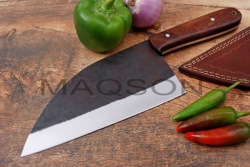 Hier erhalten Sie ein hochwertig Hand geschmiedetes 1095 stahl. Küchenmesser Hack Beil Klinge. Hack Küchenmesser Klinge. Die ebenfalls Hand gefertigte Leder Scheide besteht aus hochwertigem Rind Leder und wurde dem Messer genau angepasst.