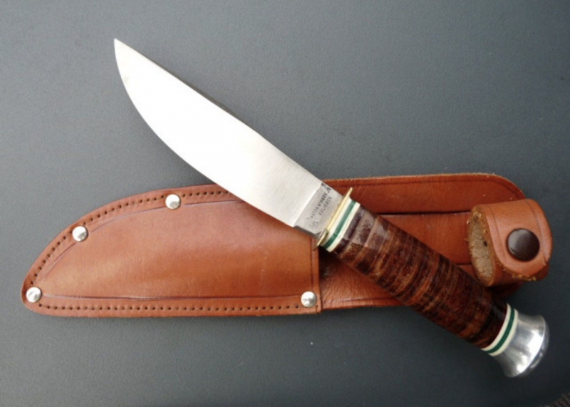 Stabiles Waidblatt, handgefertigt in Deutschland mit Parrierstange aus Neusilber und gestapelter Ledergriff.