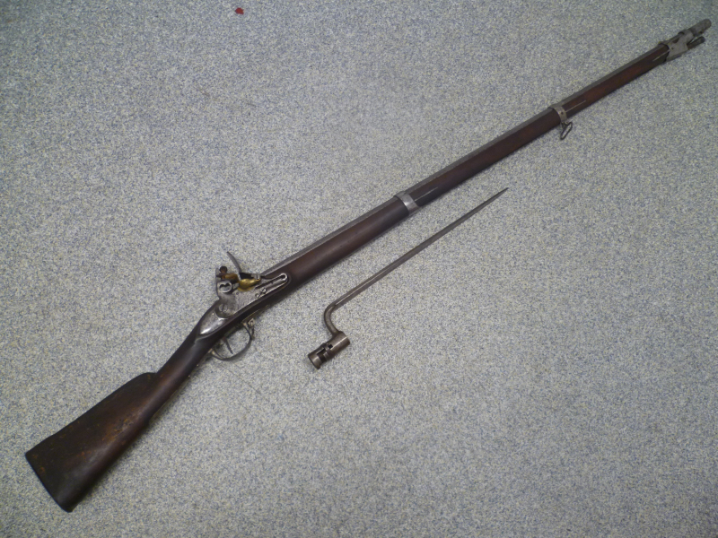 Technisch einwandfreie Steinschloßmuskete mit stärkeren Gebrauchsspuren.