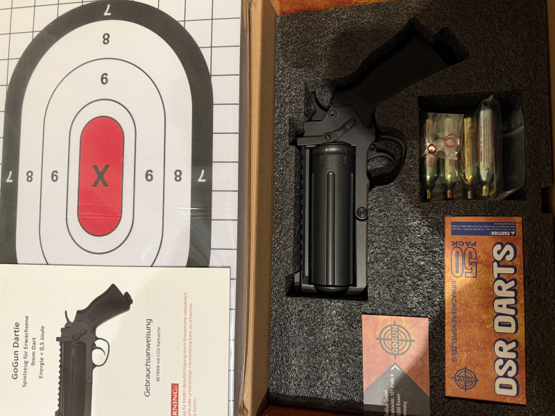 Im Lieferumfang enthalten sind 5 CO₂-Kapseln, 50 Darts, eine Zielscheibe sowie die Original-Anleitung.