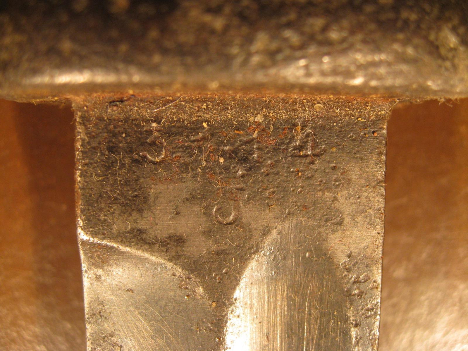 Die Klinge ist mit Nr. 3?14 und Buchstabe J; 39 und Hersteller Carl (Eickhorn?) gestempelt. Dieser ist noch unleserlich.