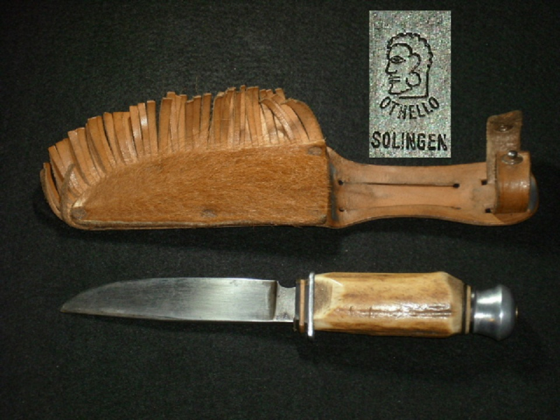 Jagdmesser - aus dem Nachlass eines HJ Pimpf, Länge insgesamt 20 cm , Lederscheide mit Leder Franseln und Kuhfell , nähte OK, Klinge OK, mit Hersteller Othello - Solingen , Horngriff, guter Zustand
