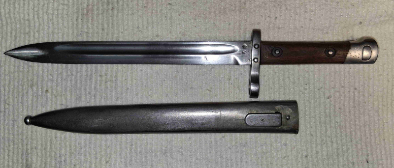 Sie bieten auf ein (mir unbekanntes) Messerbajonett mit Scheide. Gesamtlänge 355mm, Klingenlänge ab Heft 243mm, Gesamtlänge mit/in Scheide 373mm.