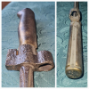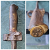 Wie auf den Bildern erkennbar rostnarbig, Messinggriff angelaufen.