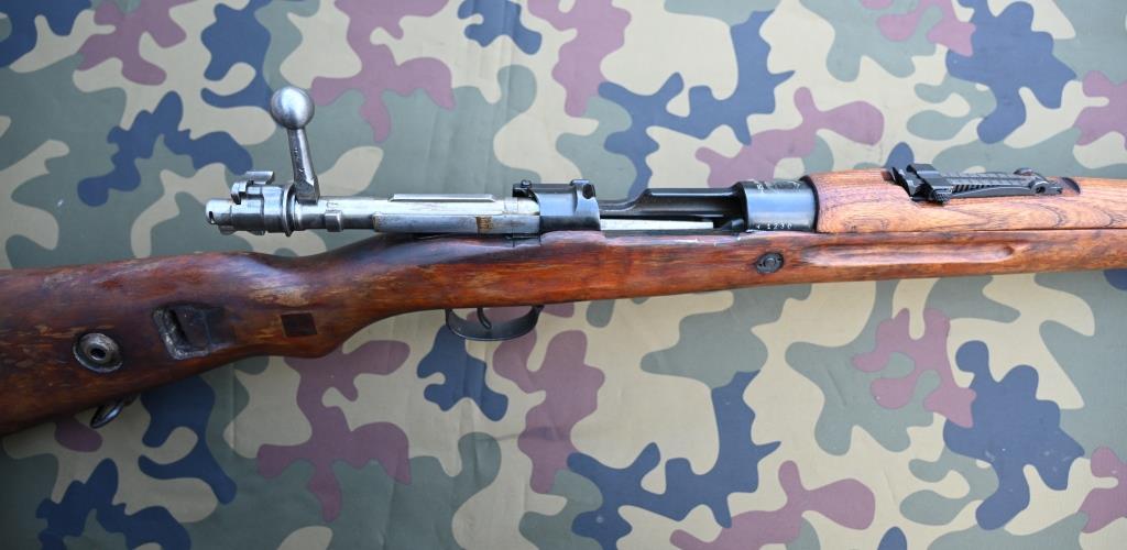 Optisch und technisch rundum ordentlicher, homogener, „normaler“ altersgemäßer Gesamteindruck, Brünierung ca. 97 % mattschwarzgrau erhalten. Gut erhaltener Nussbaumholzschaft mit allesamt normalen, völlig harmlosen Gebrauchsspuren. Handschutz aus Schichtholz, tiptop. Am Pistolengriff wurde einmal eine Trageringöse entfernt und das entstandene Loch beidseitig sauber mit einem rechteckigen Holzstück arsenalmäßig verschlossen. Kolbenplatte etwas geputzt wirkend, an einer Ecke mit leichten Närbchen vom langen Stehen auf feuchtem Boden.