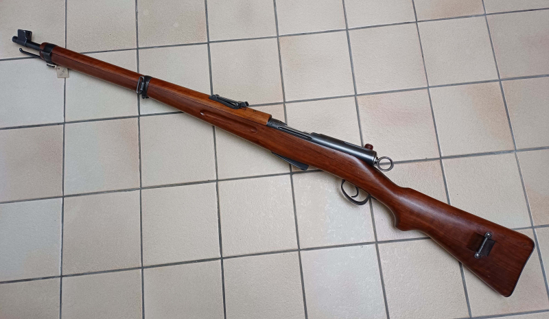 Dieser von mir ausgesuchte Ordonnanz-Karabiner mit der Waffen-Nr. 152894 wurde 1927 gefertigt. Die Waffe ist nummerngleich und hat deutschen Beschuss. Die Schweizer Waffen zeichnen für hervorragende Funktion und sauber auslösbaren Druckpunktabzug. Der Lauf ist innen blank und hat ein vierzügigen Zugprofil mit Rechtsdrall. Das abnehmbare Magazin fasst 6 Patr.. Die originale Brünierung ist zu 95 % vorhanden. Der mittelbraune, schön gemaserter Schaft und Handschutz hat nur wenige Lagerspuren. Gut lesbare Stempel, Wappen und Zahlen auf Lauf, Verschluss, Verschlussgehäuse, Magazin, Beschlagteile und auf dem Schaft.