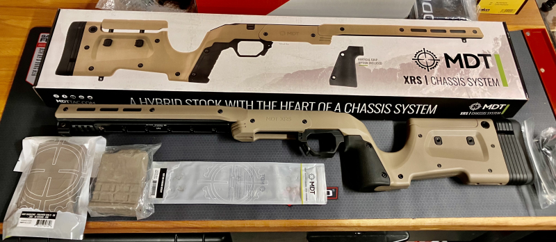 Verkaufe einen gebrauchten MDT XRS Chassis FDE für Tikka T3 (natürlich auch T3x), Short Action (SA), Rechtsausführung (RH) + Zubehör (Vorderschaftgewicht, Pica & ARCA Rail am Vorderschaft und wahlweise ein .308 oder .223 MDT Magazin in FDE). Neupreis zurzeit gute 900€ mit allen Zubehörteilen! Bild 5 dient nur der Veranschaulichung! Zustand: der Schaft wurde wie alles von mir pfleglich behandelt, hinter der Baricade-Stop wurde eine Gewindebohrung für die ARCA Rail angebracht, dass keine Lücke zwischen Rail und Baricade-Stop entsteht und auch die ARCA Rail bzw. das Chassis Bombenfest auf dem Tripod gehalten wird.