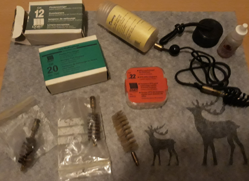 Verkaufe Zubehőr aus Jagdnachlass zur Gewhrreinigung,alles wie auf dem Bild sichtbar,fűr Flintenlauf,Bűrsten,Filze etc.Filze Kal 20 ungeőffnet.,Kal 5,6 mm KK,Bűchsen etc,Inhalt siehe Foto,Kal 12 Restfilze,kl Flasche Ől,Reinigungsschnur zum schnellen Reinigen direkt am Stand oder auf der Jagd,KK Filze usw..Zustand gebraucht, selten oder auch garnicht benutzt. Verkaufe alles an Zubehőr wie auf den Bildern sichtbar..Schauen Sie sich die Bilder gut an,diese sind wesentlicher Bestandteil der Beschreibung(versicherter Versand)da Privatverkauf ohne Garantie oder Rűcknahme
