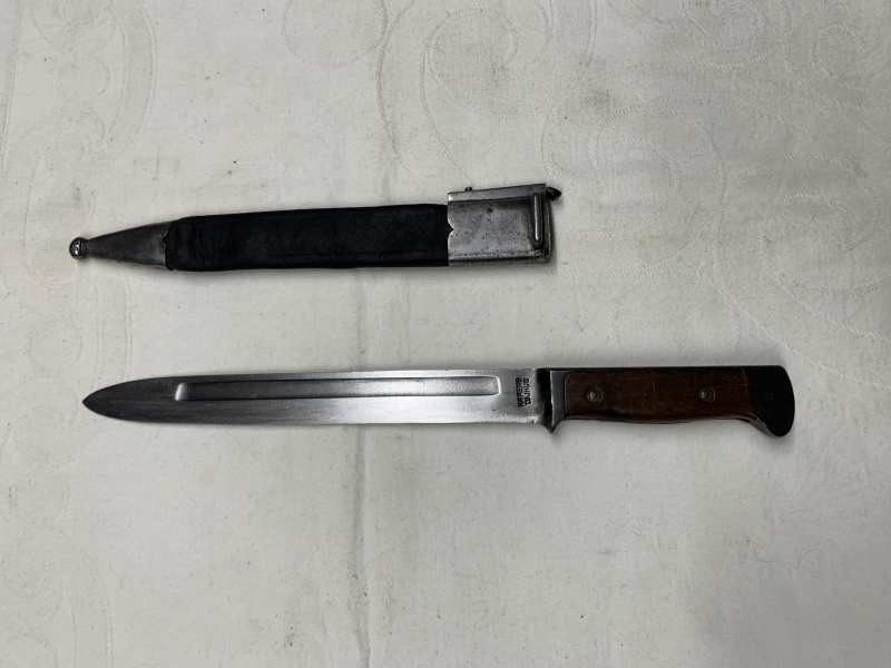 Das Kampfmesser, Dänemark wurde aus einem dänischen Krag Jörgensen Bajonett Mod. 1889 umgearbeitet. Klingenlänge 22 cm, Gesamtlänge 32 cm, Bestempelungen ( siehe Bilder ). Das Kampfmesser und die Lederscheide sind in einem guten gebrauchten Zustand ( siehe Bilder ).