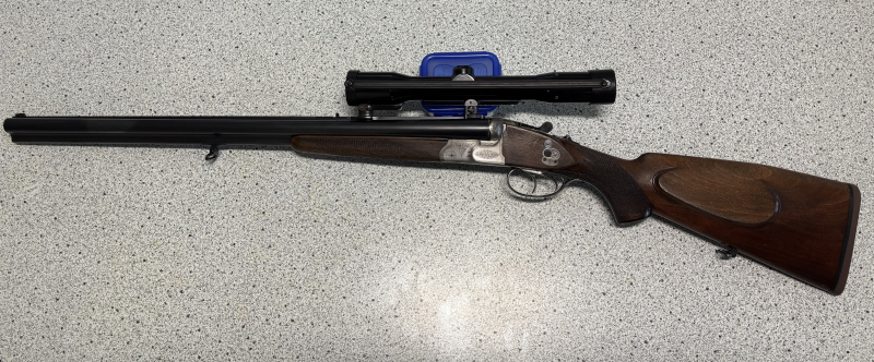 Gravierte Stahlbasküle, seitliche Schiebesicherung, montiert mit Zielfernrohr,HENSOLDT WETZLAR DIAVARI 1,5 = 6 Abs. 1, mittels SEM Montage Nußbaumschaft mit Deutscher Backe, Riemenbügeln und Schaftkappe Läufe sehr gut, Brünierung 100%, Schaft gut, Gebrauchtwaffe gut