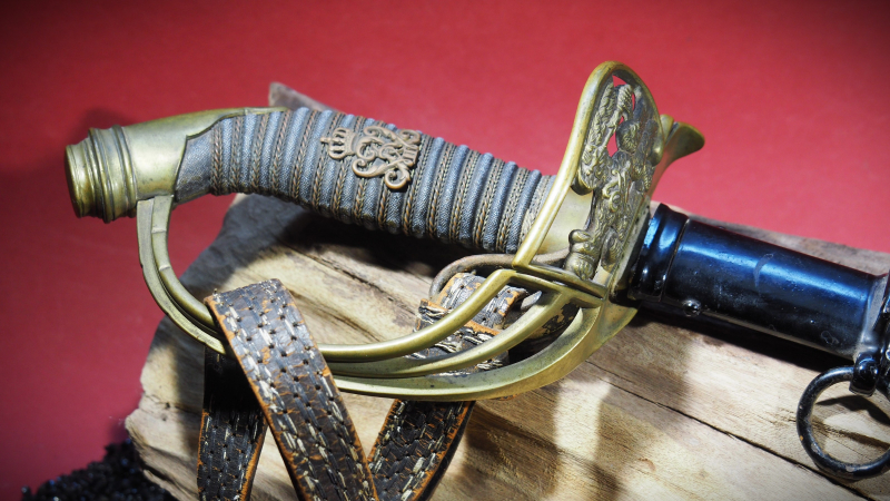 Der Degen ist in sehr gutem - unverbasteltem - Zustand. Das Klappkorbgefäß war wohl einst vergoldet und trägt noch vereinzelt Reste davon. Der Griff ist mit - vollständig erhaltener - Rochenhaut unterlegt und mit gedrilltem Silberdraht gewickelt. Die Wicklung ist ebenfalls vollständig und unbeschädigt. Der Griff trägt die Insignien "WR" "II" für König Wilhelm den Zweiten von Preussen. Auch das Gefäß trägt die Insignien des damaligen, letzten König des deutschen Reiches mit Krone und Zepter. Das Portepee ist vorhanden und in ebenfalls gutem Zustand - nicht brüchig oder rissig !