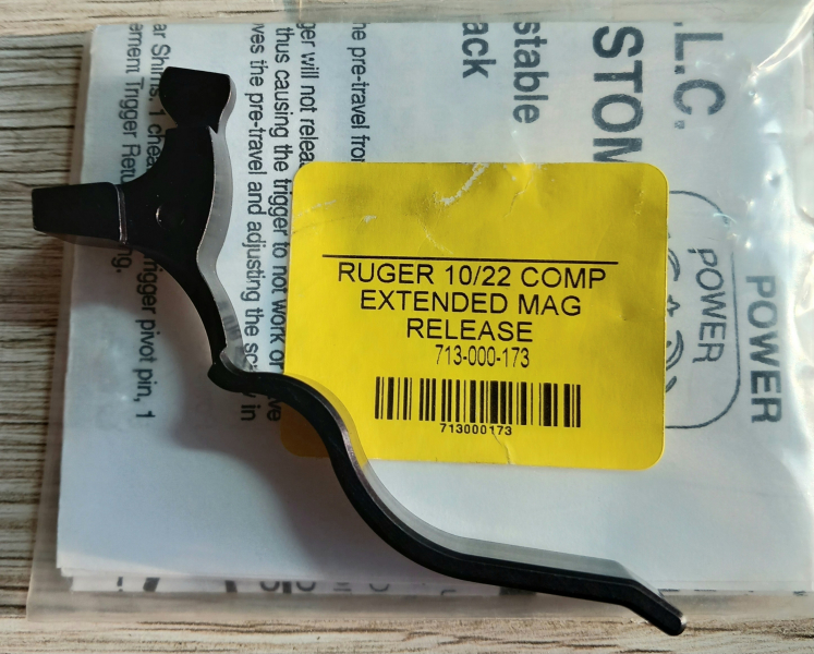 Hier nun ein absolut neuwertiger sogenannter Extended Magazine Release ( ein verlängerter Magazinauslöser ) für die Ruger-Modelle 10/22. Material Aluminium, Hersteller Power Custom USA.