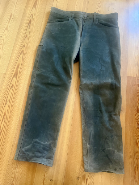 Dunkelgrüne Jagdhose aus Leder mit Knicker- und Gesässtasch, innen grün gefüttert, Marke Kos, Grösse 56 oder XL..