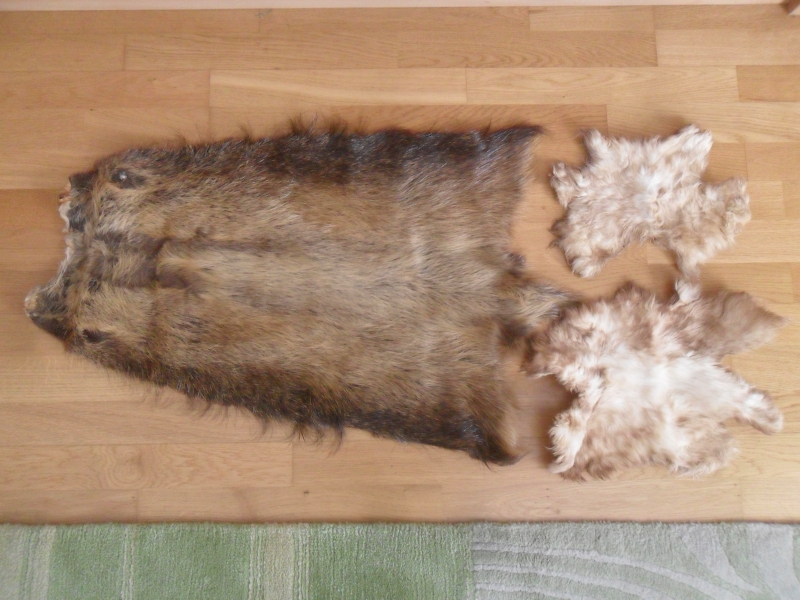 Biete für Bastelarbeiten im Trapperbereich ein gegerbtes Nutriafell und zwei Stücke gegerbtes Kaninchenfell an. Diese Teile eignen sich gut für Bastelarbeiten im Bereich Trapper an. Das Nutriafell ist ca. 75 cm lang. Dies ist eine Privatauktion.