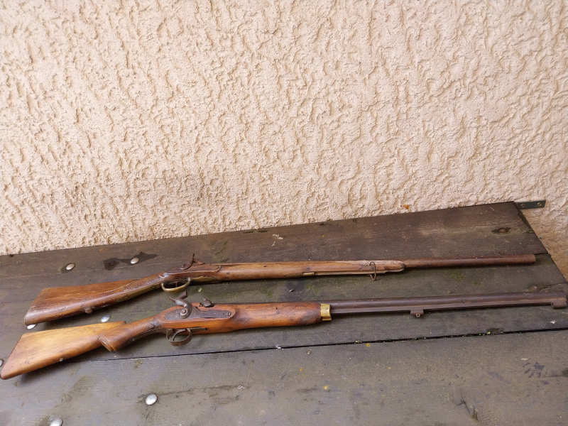 Zum Verkauf stehen 2 alte Perkussionsgewehre das eine lässt sich spannen und abschlagen das andere Gewehr ist Defekt ich werde beide als defekt anbieten bei beiden ist kein hersteller zu erkennen. Der Versand in die EU ist 25 Euro. Privat verkäufer keine Garantie keine Rücknahme.