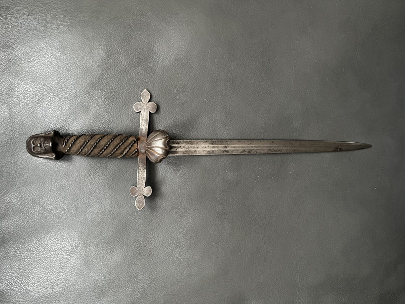 Aus Sammlungsauflösung wird ein mittelalterlich anmutender Dolch angeboten. Alter und Herkunft sind unbekannt. Klingenlänge ca. 30 cm, Gesamtlänge ca 46 cm. Vielleicht ist das etwas für mittelalterliches Reenactment? Der Verkauf dieses gebrauchten Artikels erfolgt von Privat unter Ausschluss jeglicher Gewährleistung, Garantie, Sachmängelhaftung und Rückgabemöglichkeit. SHIPPING ONLY TO DESTINATIONS INSIDE EU!