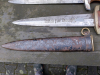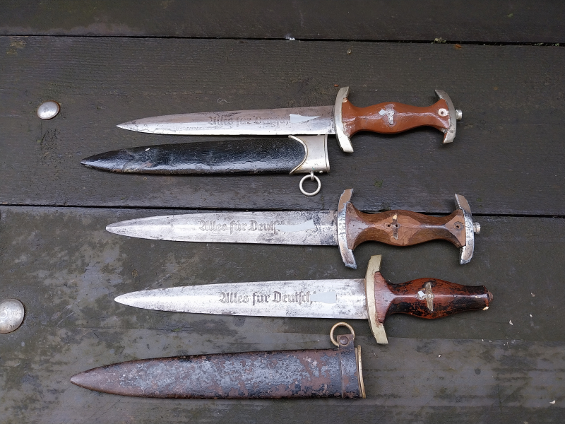 Zum Verkauf stehen 3 SA Dolche Fundzustand von oben nach unten bei dem ist Griff gestrichen und es fehlen am Griff teile vom Holz siehe Bild die Scheide Lackiert das untere Blech fehlt siehe Bild die parierstange mit gebietsmarke Wm der hersteller ist nur noch schwach zu erkennen, der mittlere ist der Holzgriff komplett defekt, die Klinge hat denn hersteller Arsculap Tuttlingen ohne Scheide, der dritte Dolch fehlt das obere Stück am Holzgriff siehe Bild der Adler ist noch sauber drin die Parierstange ist mit Wf gestempelt hersteller SMF Solingen. Der Versand in die EU ist 20 Euro. Privat verkäufer keine Garantie keine Rücknahme.