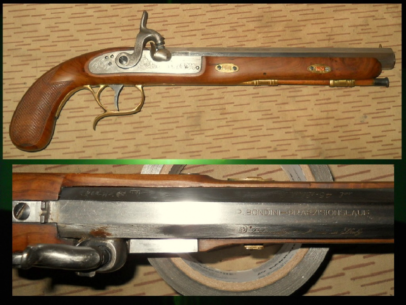 ...aus Sammlernachlass … edele, seltene BONDINI perkussion Vorderlader-Pistole … voll funktionsfähig und mit gültigem, italienischem Beschuss … gezogener Achtkant Präzisionslauf im Kal. .45 … das Schloss ist in klassischer Weise gebaut, also mit Schenkelfeder – und hat eine schöne Gravur … der augenscheinlich rissfreie Schaft verfügt über eine Fischhaut-Verschneidung und ist wunderschön gemasert … die Laufhaltekeile sind wohl nicht original … Piston ist nicht verschlagen – die Gewinde sind O.K. … Schloss- u. Abzugsfunktion voll gegeben … den Gesamtzustand würde ich als gebraucht – gut bezeichnen