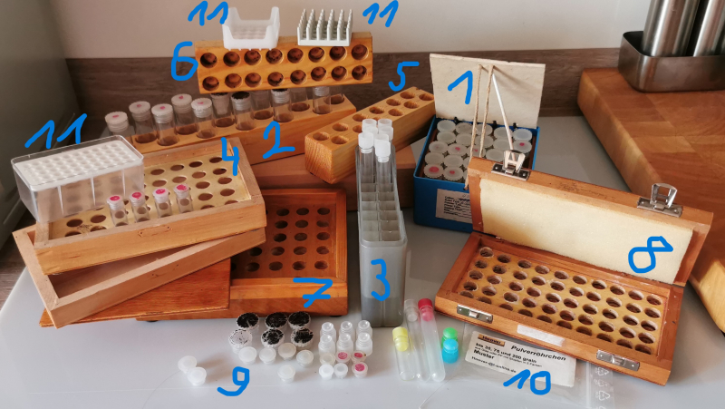 4. Holzkistchen mit Deckel für 40 Röhrchen mit 4 Pulverröhrchen drin