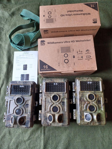 Zum Verkauf stehen drei Wildkameras "Ultra HD Weitwinkel" von Bearstep (Hausmarke Askari) mit 16 Megapixel.