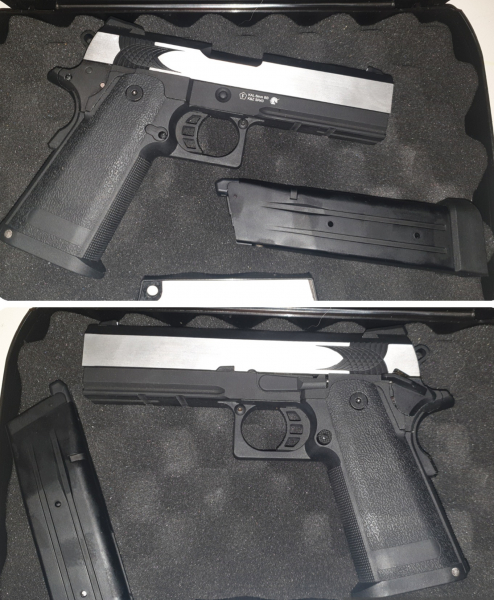 KLI KL Capa SR43 Schwarz Silber Hi Power Schlitten mit schönem Fräsmuster diese Waffe ist im Ausland als schnellste Full Auto im Kurzwaffen Format bekannt, aber nur bei Kennern , da sie auch recht selten ist. Hi Capa Magazin starker Kickback 6mm Blowback Gas Neuwertig, 1Magazin zum Testen verschossen.