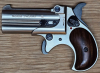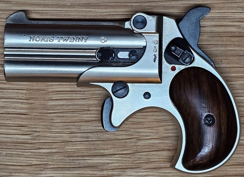 In dieser Auktion geht es um den abgebildeten Noris Twinny im Kaliber .380K bzw. 9mmR Knall. Die Waffe kommt im originalen Karton mit sämtlichen Zubehör und das scheint alles unbenutzt zu sein. Die Waffe selbst ist mit den optionalen Nußbaum-Holzgriffschalen ausgestattet, was hervorragend mit der Werksvernickelung harmoniert. Zusätzlich sind schwarze Plastik-Griffschalen mit im Karton. Die Waffe scheint ungeschossen, weist aber minimale Tragespuren auf.