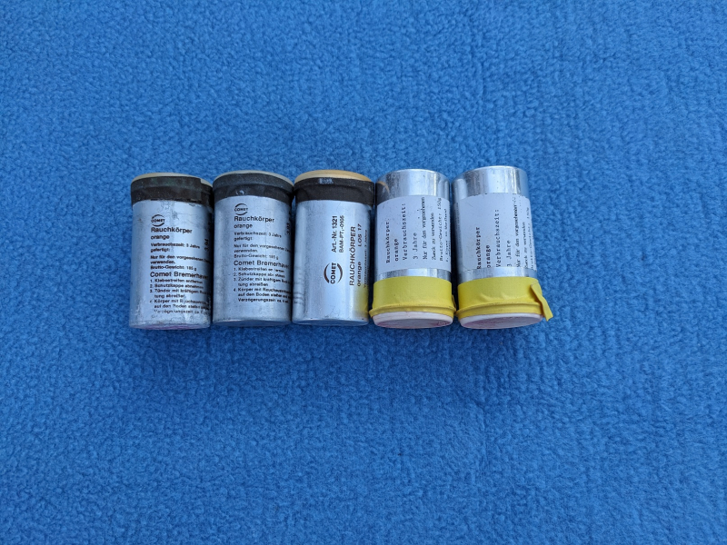Diese Rauchkörper wurden von einem älteren Herrn in einer hinter Schrankwänden verborgenen Kellernische zusammen mit weiteren erlaubnisfreien Abwehrmitteln, größeren Mengen Konserven, Trinkwasserfiltern, Petroleumlampen, Benzinkocher, Werkzeugen und Wolldecken gelagert....
