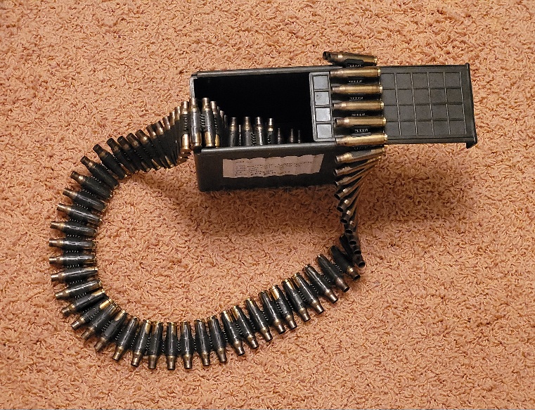 Militärische Hülsen Kaliber .308 Winchester bzw. 7,62x51mm NATO auf voll bestücktem Maschinengewehrgurt Modell DM1 in Gurtkasten Modell DM40004. Siehe Bilder.