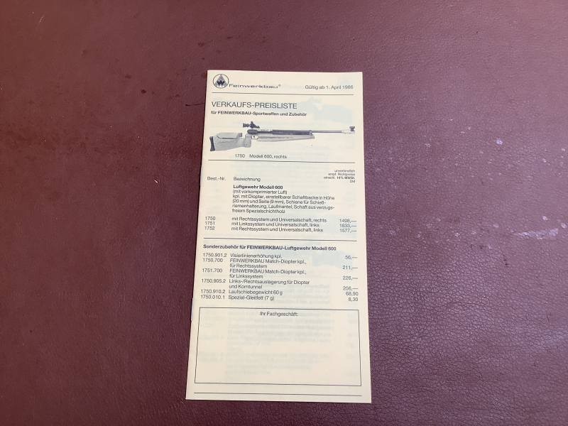 Feinwerkbau Verkaufs-Preisliste für Sportwaffen und Zubehör 1. April 1986