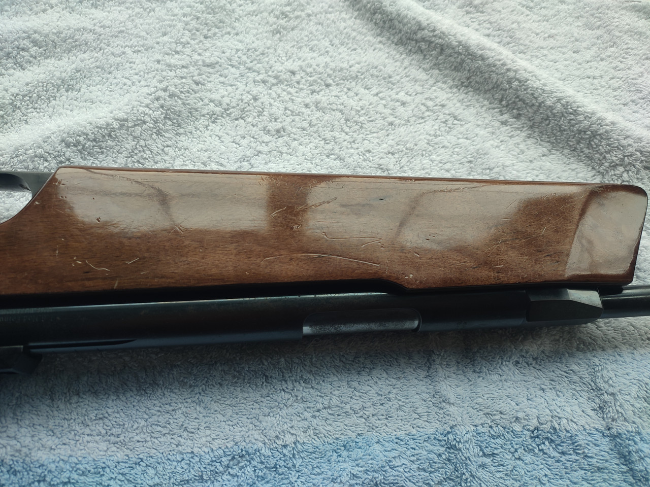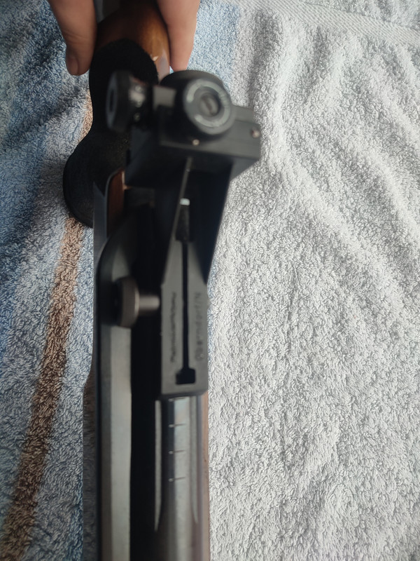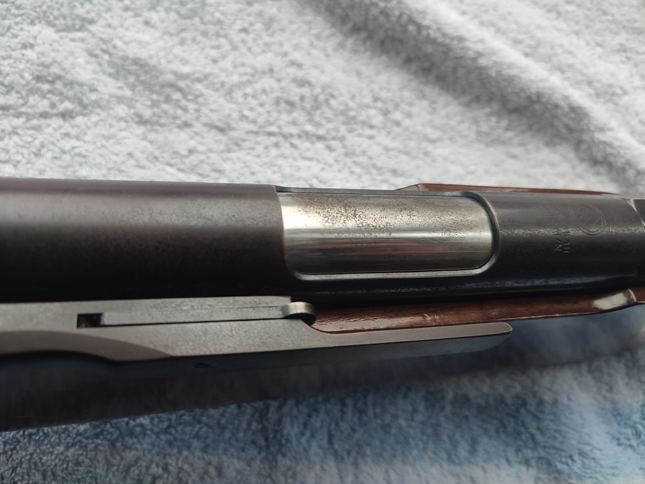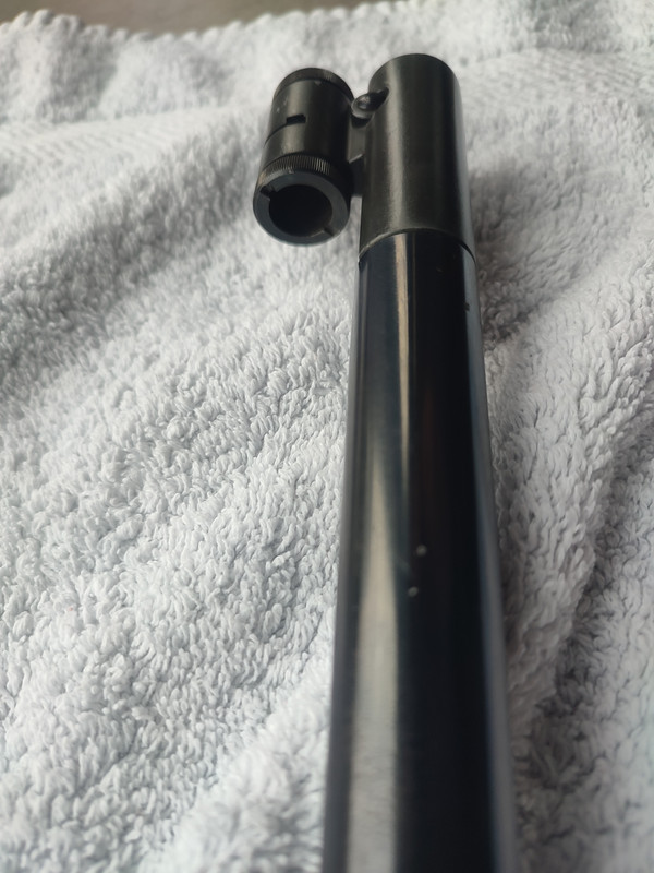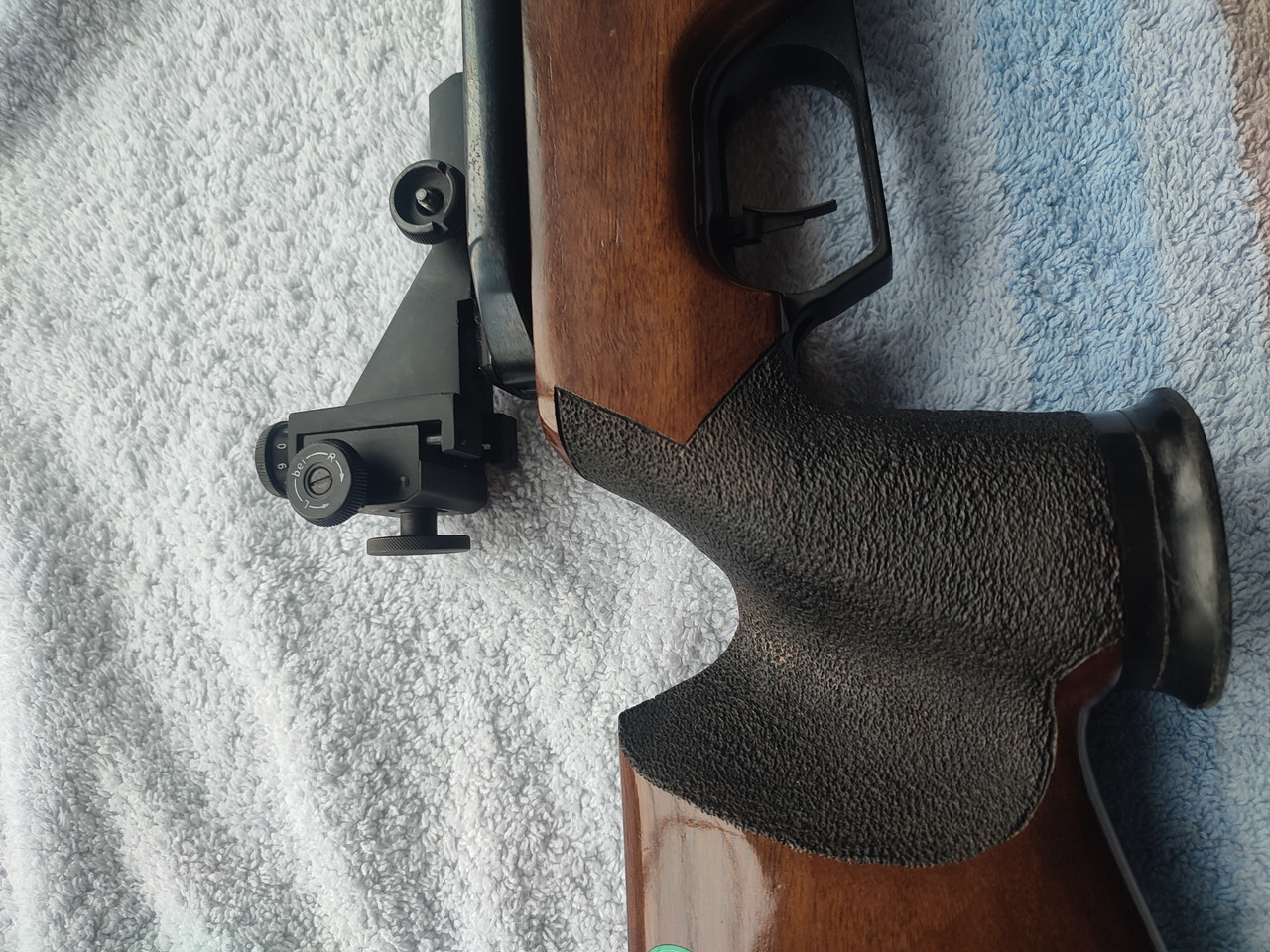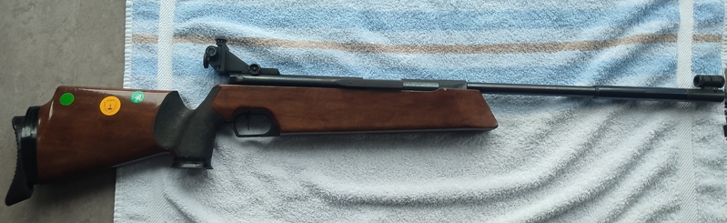Aufgrund eines Bieters ohne innerdeutsche Versandadresse hier noch einmal: Zustand & Technik: Das System ist grundsätzlich funktionsfähig. Leider ist vor ein paar Tagen die Laufdichtung aufgrund des Alters zerbröselt. Die v0 ist somit stark beeinträchtigt. Die Rückstände habe ich weitgehend entfernt. Der Austausch ist ist relativ leicht möglich, ohne das Gewehr komplett zerlegen zu müssen. Mir fehlen jedoch die räumlichen und zeitlichen Möglichkeiten die Dichtung zu ersetzen. An Lauf, Spannhebel und System befinden sich Flugrostansätze und die Brünierung ist Teils stark abgerieben, die Substanz des Stahls ist jedoch solide. Eventuell lassen sich die Teile nochmal nachbrünierten. Montiert ist ebenfalls ein Laufmantelgewicht Die Mündung ist wie auf den Bildern zu sehen in einem guten Zustand und nicht bestoßen Der Diopter ist ebenfalls in einem guten Zustand und die Verstellung klar und leichtgängig Der Schaft weist die üblichen Altersgemäßen Gebrauchsspuren auf, ist aber nicht gebrochen. Besonders die Punzierung am Griff ist noch in einem sehr guten Zustand Bei Fragen oder Wünschen nach weiteren Bildern, können Sie mich gerne kontaktieren! Technische Details im Überblick: System: Seitenspanner, Federdruck mit mechanischem Rücklaufausgleich Kaliber: 4,5 mm (.177) Diabolo Lauflänge: ca. 500 mm (Match-Ausführung) Schäftung: Rechtsschaft mit verstellbarer Schaftkappe Gesamtgewicht: ca. 5,0 kg Kennzeichnung: "F" im Fünfeck vorhanden