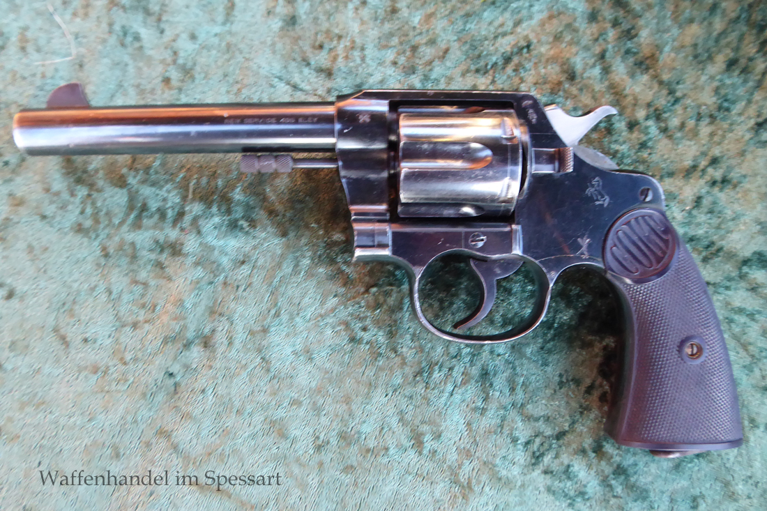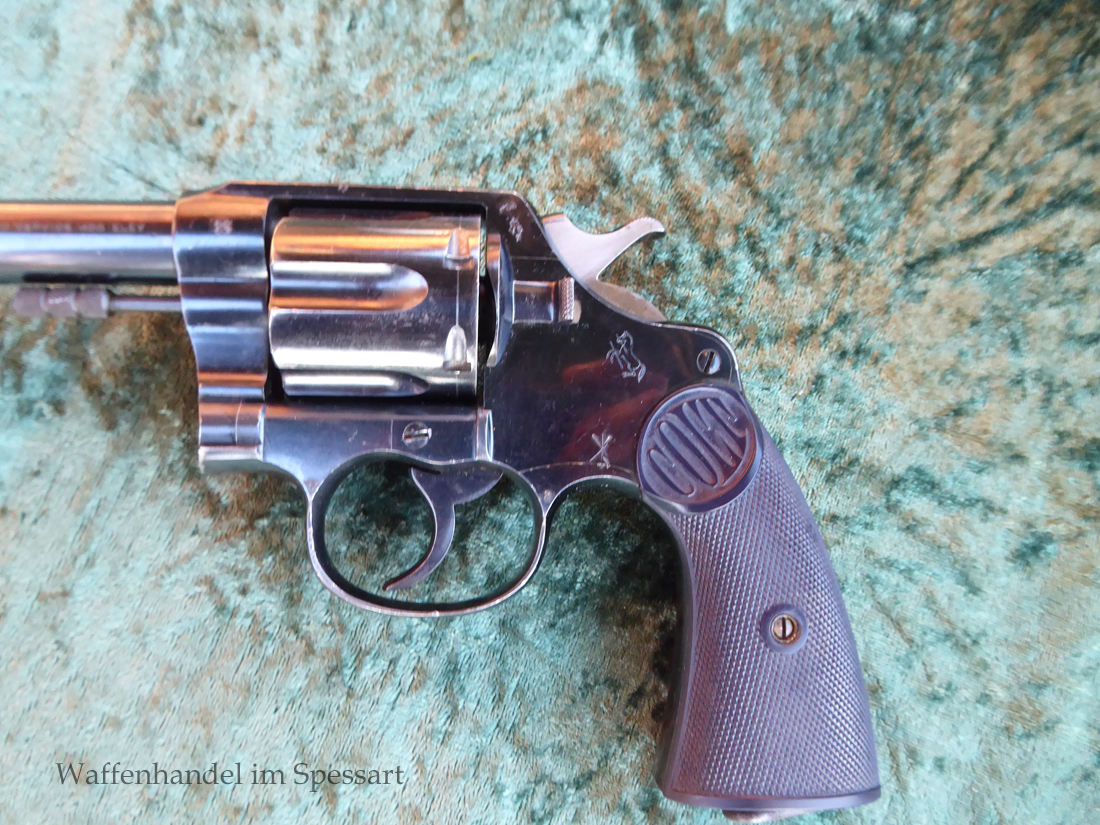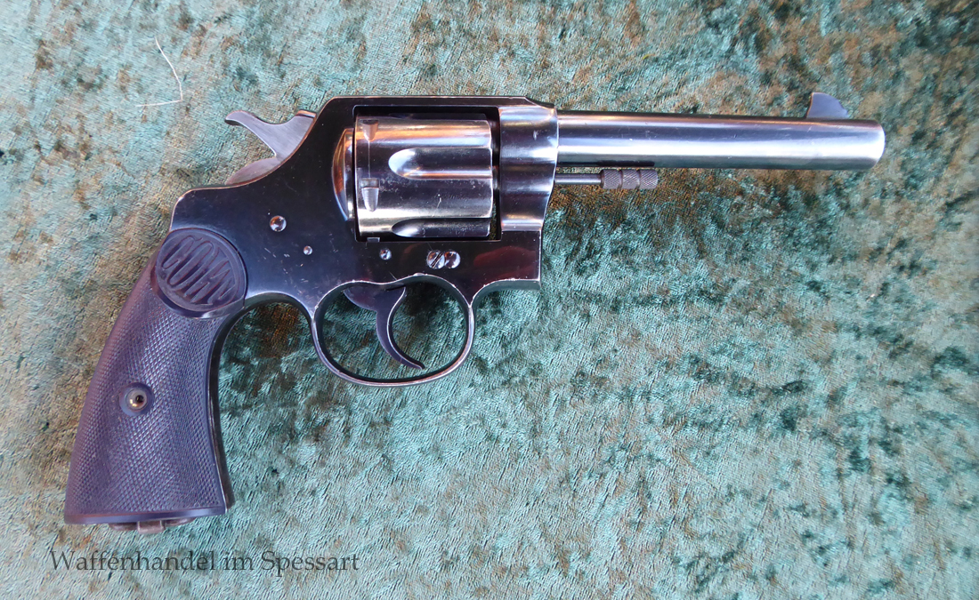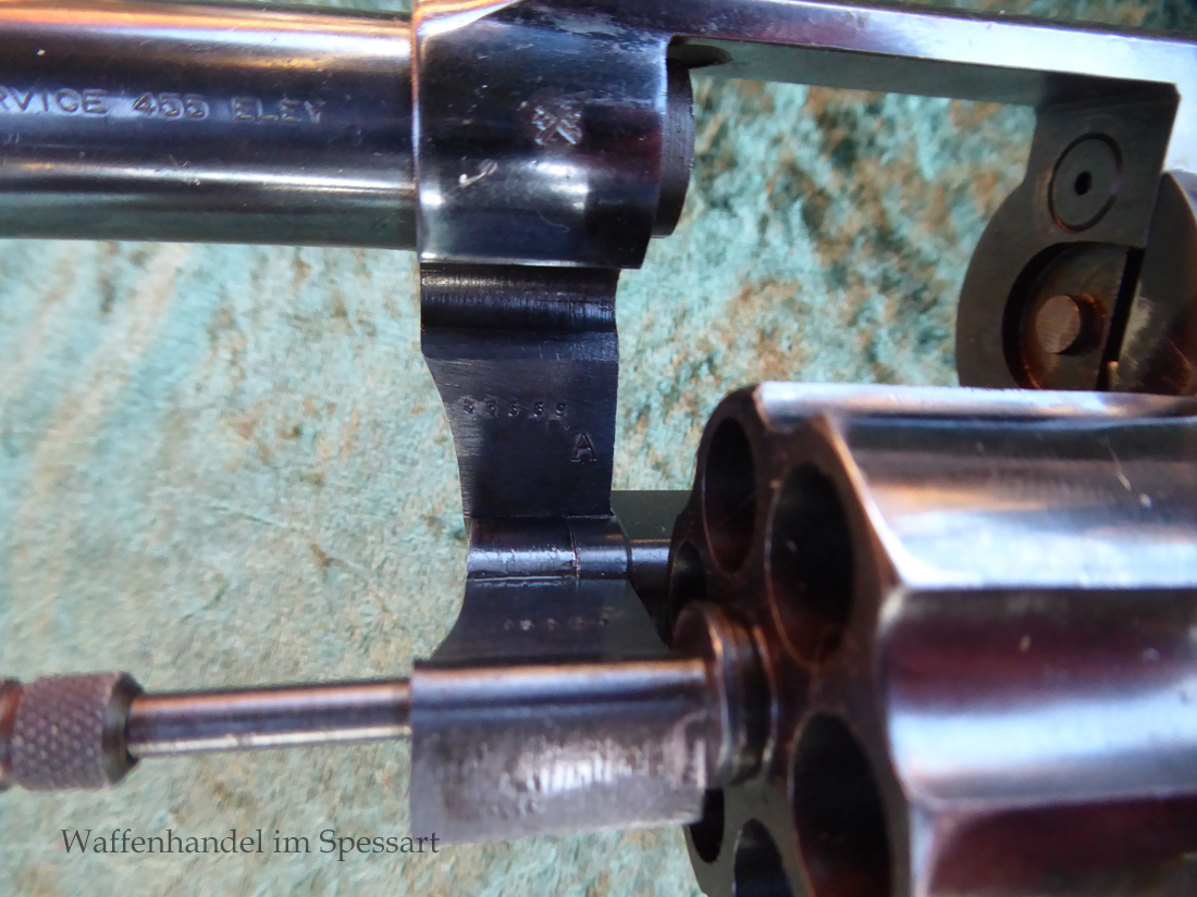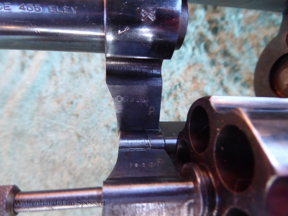 Kal..455ColtElayEnf. Ser.Nr. 85669. Fertigungsjahr 1915. Scharfkantiges blankes Laufinnere. Sehr gute noch erhaltene bläuliche orig. Brünierung. Sehr gute Colt typische Mechanik mit "stehender" Trommel. Britischer Militär Eigentumsstempel gekreutzte Fahnen. Sowie Broad Arrow auf der linken Seite des Rahmens.