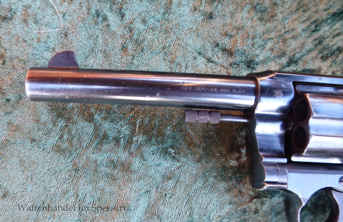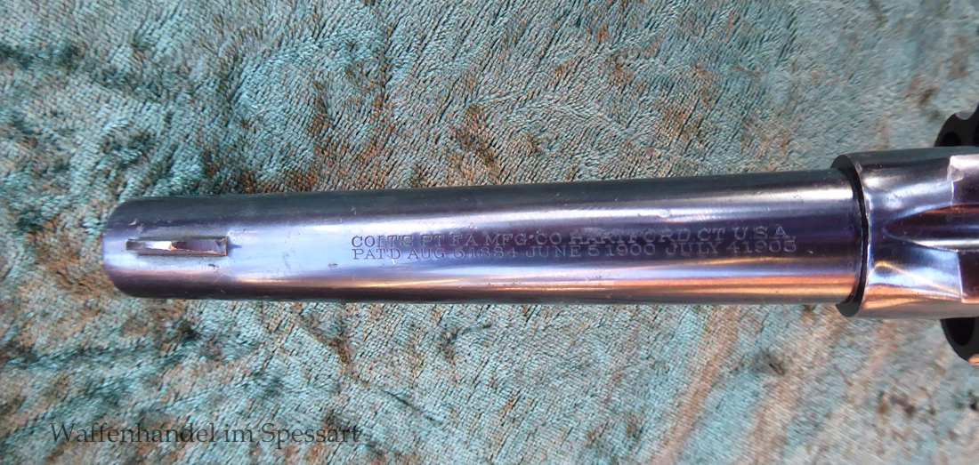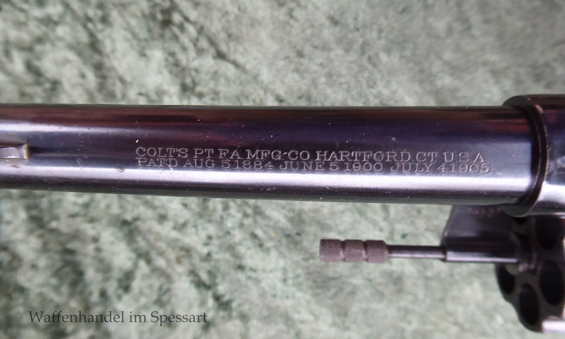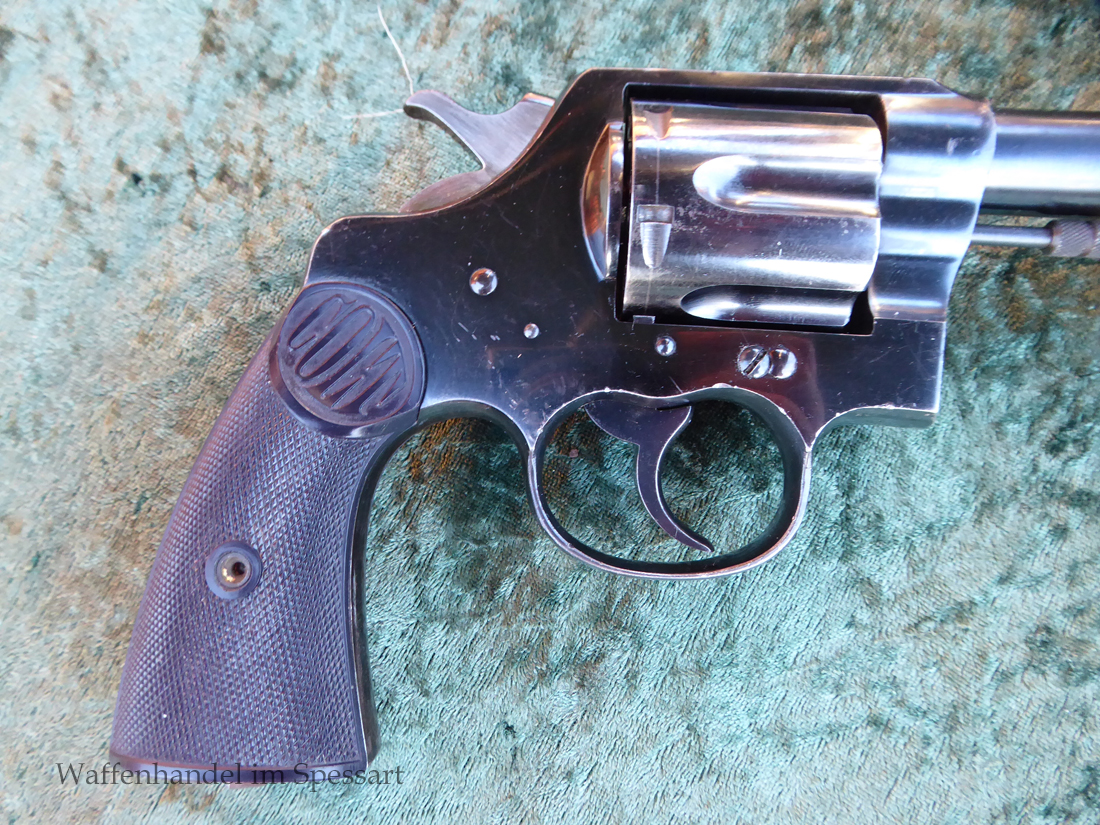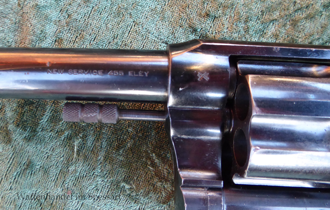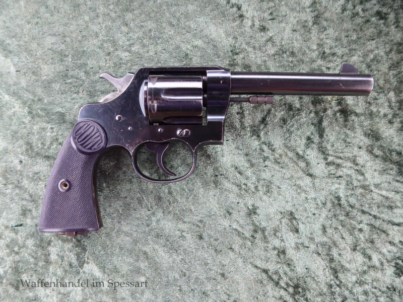 Kal..455ColtElayEnf. Ser.Nr. 85669. Fertigungsjahr 1915. Scharfkantiges blankes Laufinnere. Sehr gute noch erhaltene bläuliche orig. Brünierung. Sehr gute Colt typische Mechanik mit "stehender" Trommel. Britischer Militär Eigentumsstempel gekreutzte Fahnen. Sowie Broad Arrow auf der linken Seite des Rahmens.
