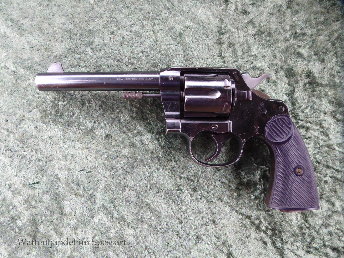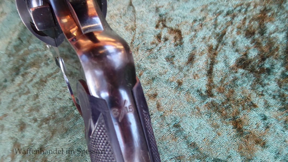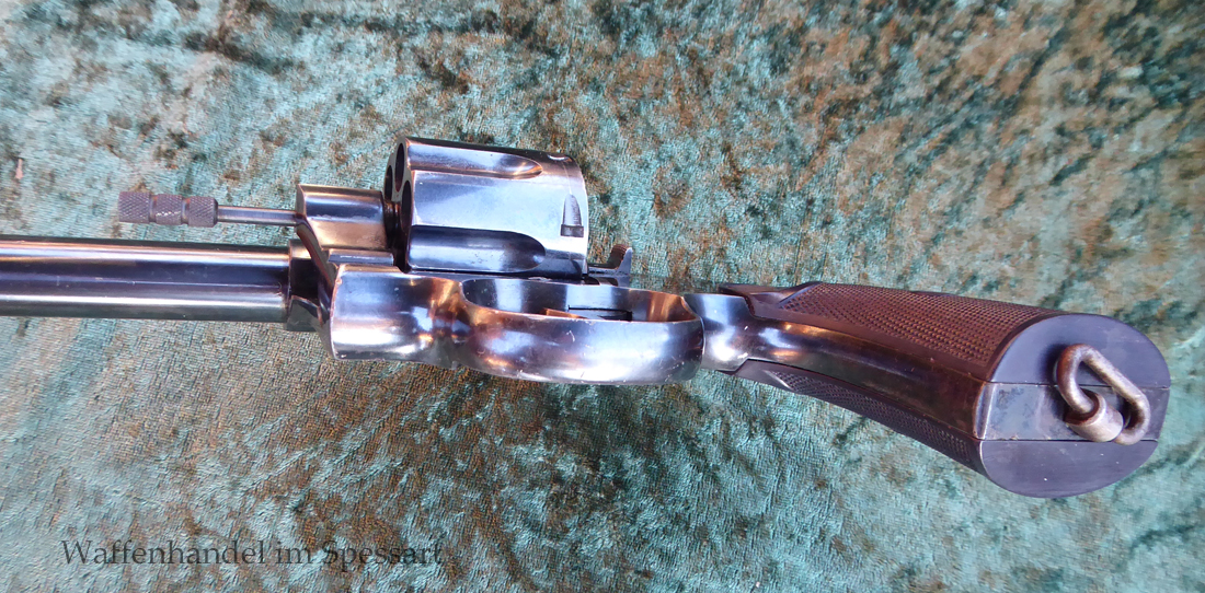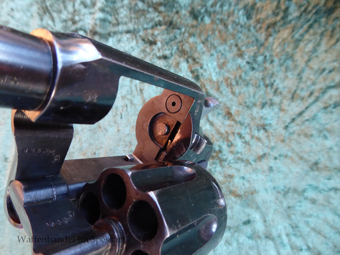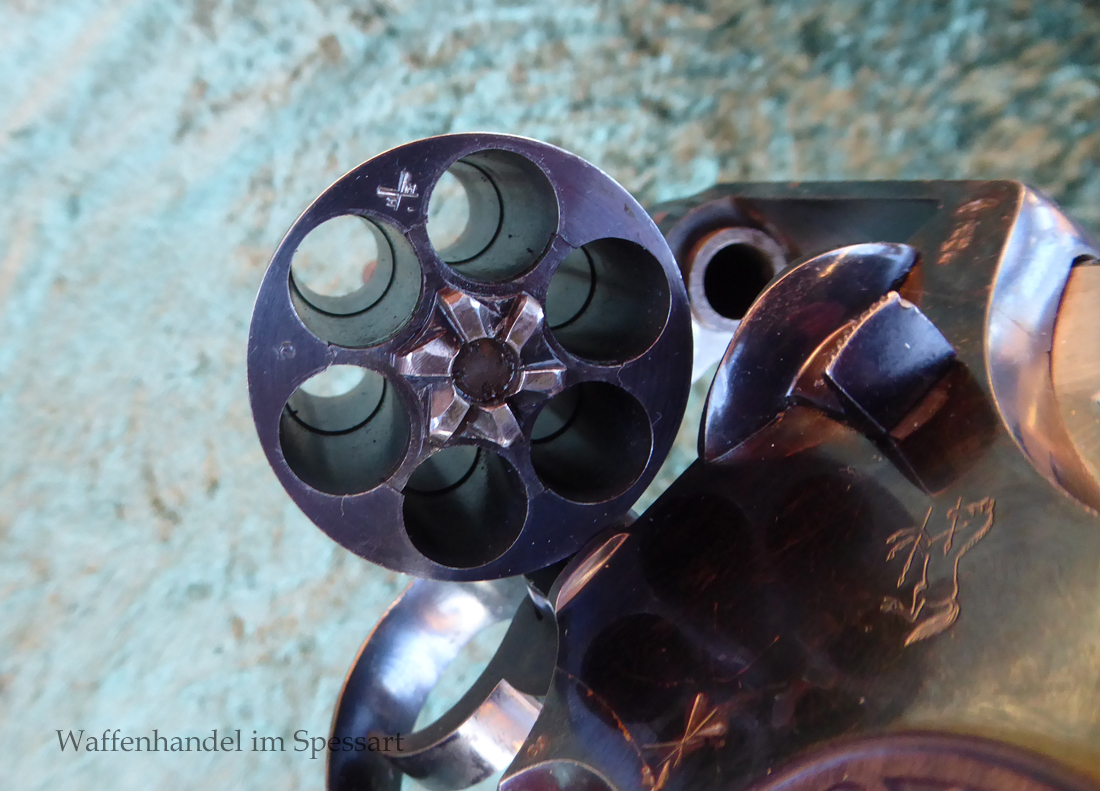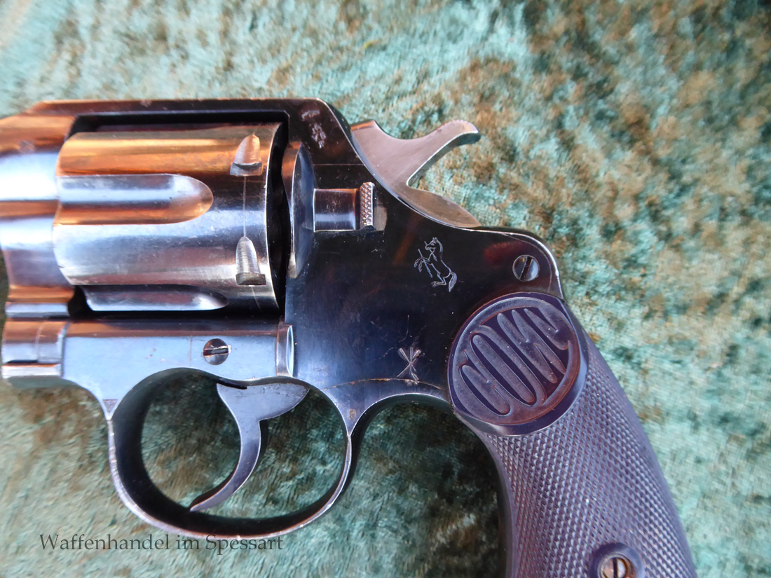 Kal..455ColtElayEnf. Ser.Nr. 85669. Fertigungsjahr 1915. Scharfkantiges blankes Laufinnere. Sehr gute noch erhaltene bläuliche orig. Brünierung. Sehr gute Colt typische Mechanik mit "stehender" Trommel. Britischer Militär Eigentumsstempel gekreutzte Fahnen. Sowie Broad Arrow auf der linken Seite des Rahmens.