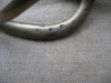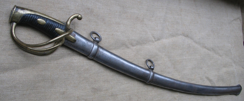 komplettes Griffstück und Scheide für einen leichten Kavalleriesäbel Frankreich aus der Napolionischen Zeit. Das Stück wurde zu Restaurationszwecken (neue belederung des Griffstücks) zerlegt, leider konnte die Klinge bei Durchsicht des Nachlasses nicht mehr ausfindig gemacht werden und wurde vermutlich versehntlich entsorgt. Gefäß mit zahlreichen Marken, Scheide altersbedingt im guten Zustand (keine Durchrostungen), lediglich das Mundeisen fehlt. Einschubtiefe in die Scheide (mittels Zollstock) 89 cm. Offnungbreite oben (ohne das fehlende Mundeisen) ca. 40 mm.