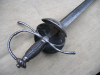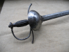 ein kräftiges Schalenrapier, Reiterwaffe. Eisengefäß mit Nierenschalen, Parierbügel und Spangen sowie gezwirbeltem Knauf . Breite beidseitig geschliffene Klinge, diese vorderseitig mit kleiner Wolsmarke und Sternen. Klingenlänge ca. 89 cm. Gesamtlänge ca. 107 cm, Klingenbreite oben ca. 33 mm.