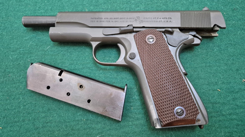 Colt Goverment 1911 A1 Lauf blank, rechts im Abzugsbereich und beim Magazinschacht Abrieb der Brünierung, Magazin s. Foto In diesem Zustand 1994 von Frankonia erworben.