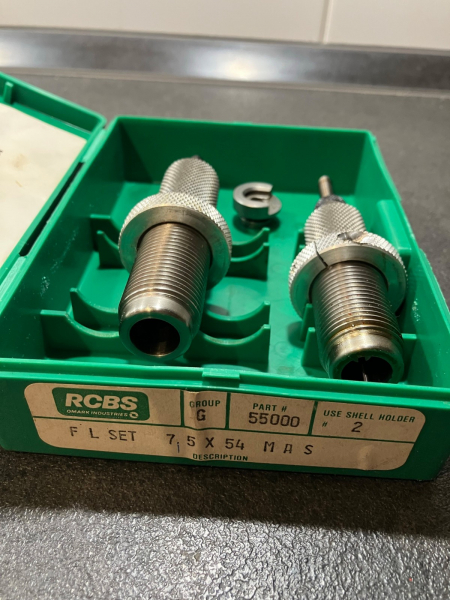 Aus Nachlass abzugeben ein gut erhaltenen 7,5x54 Mas RCBS Matrizensatz inklusive Hülsenhalter.