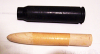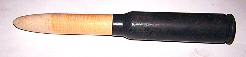 Kartusche Patrone 30x173 aus Stahl, Ostblock (Tschechien?). Ich habe eine Holzgeschoß dazu gedrechselt. Dies kann weiter eingeschoben weden. Die Patrone ist abgeschossen, ohne jeden Inhalt.