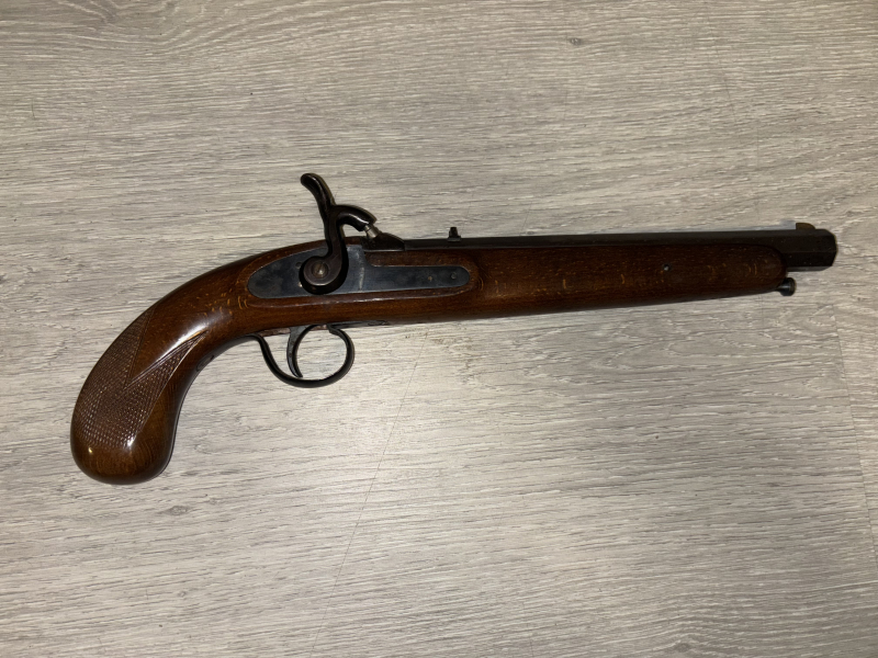 Angeboten wird Historische Spanische Vorderlader Perkussionspistole, im Cal.45 mit gültigem Beschuss .