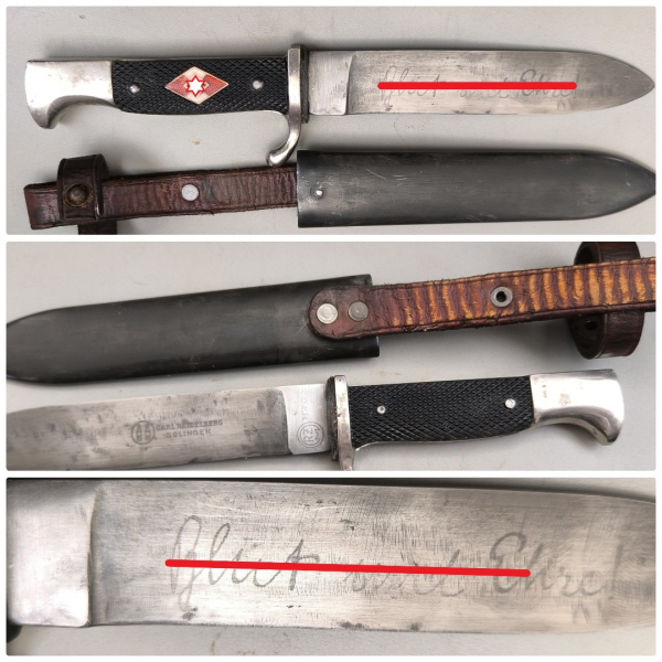 Zum Verkauf kommt dieses gebrauchte, tolle Fahrtenmesser im guten Zustand, von dem Blankwaffenhersteller CARL HEIDELBERG aus SOLINGEN RZM M7/65. Es befindet sich in einem zeitgemäß guten Zustand mit Gebrauchsspuren, da es ja auch genutzt wurde. Die Klinge hat Patina und ist wohl noch von Kinderhand geschärft worden. Devise und Hersteller sind noch gut lesbar. Raute ist leicht beweglich. Die Scheide ist wohl etwas später dazu gekommen. Privatverkauf, ohne Rücknahme und Garantie.